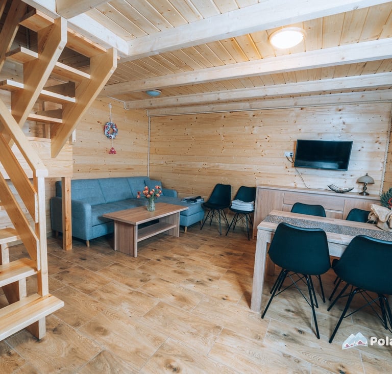 Pragniemy Was zaprosić do odkrycia niepowtarzalnego uroku naturalnych, drewnianych wnętrz naszych domków. Każdy z nich został zaprojektowany z dbałością o szczegóły, abyście mogli poczuć się jak w przytulnym górskim gnieździe. Wykorzystaliśmy drewno jako główny materiał wykończeniowy, co nadaje naszym domkom ciepły i autentyczny charakter. Drewniane ściany i sufit sprawiają, że atmosfera jest przyjazna i sprzyja relaksowi po intensywnym dniu na stoku.